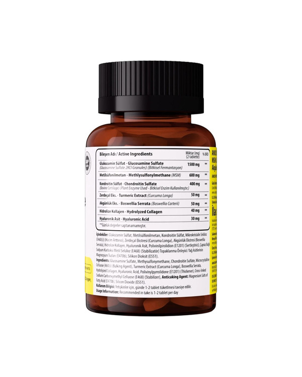 • حاوی گلوکزامین سولفات، کندرویتین، MSM، کلاژن نوع II، هیالورونیک اسید، زردچوبه و بوسولیا
